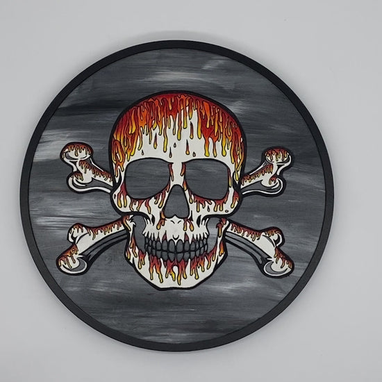 Make a bold statement with this one-of-a-kind hand-painted layered wood art piece. Measuring approx. 11.5 inches in diameter and 12 mm thick, this circular design features a striking skeleton skull at its center. The skull is brought to life with vivid red, orange, and yellow paint drips outlined in black, creating a dramatic contrast against the white bone and deep black-and-metallic gray background.